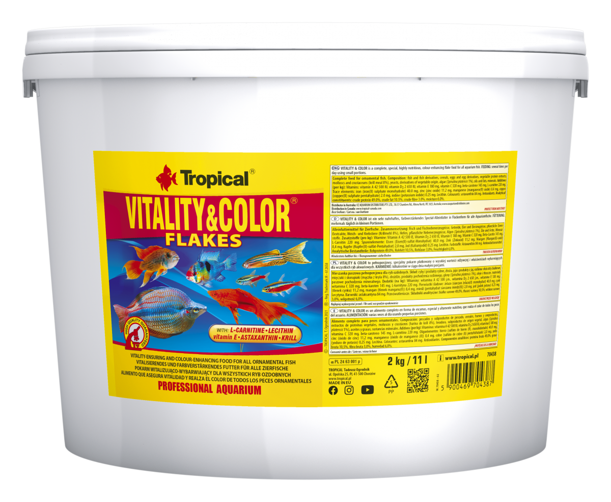 VITALITY & COLOR FLAKES ist ein proteinreiches, vitalisierendes farbverstärkendes Flockenfutter mit Astaxanthin für die tägliche Fütterung alles- und fleischfressender Fische. Wegen seines hohen Gehalts an Protein, Vitamin E und Lecithin wird es auch für die Aufzucht und Brutzeit empfohlen.