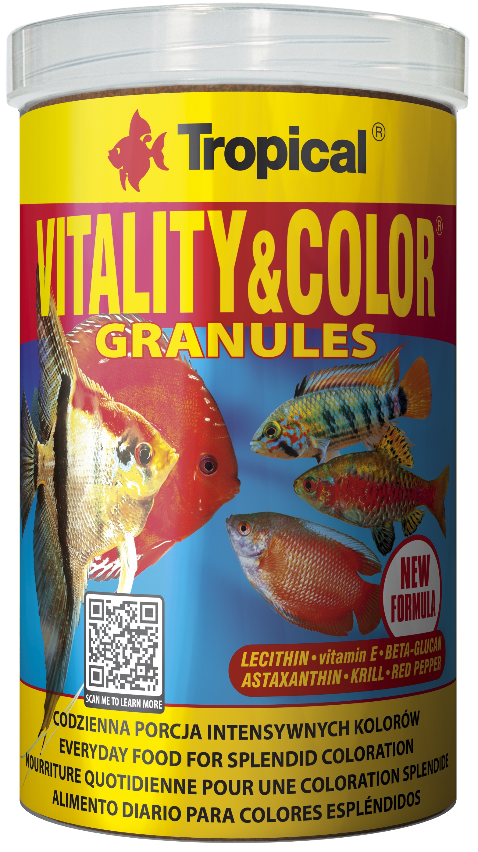 VITALITY & COLOR GRANULES ist ein proteinreiches, langsam sinkendes Futtergranulat (ca. 1-2mm) mit farbfördernden und vitalisierenden Eigenschaften für alles- und fleischfressende Aquarienfische, die ihre Nahrung in den mittleren Wasserschichten oder am Grund suchen.