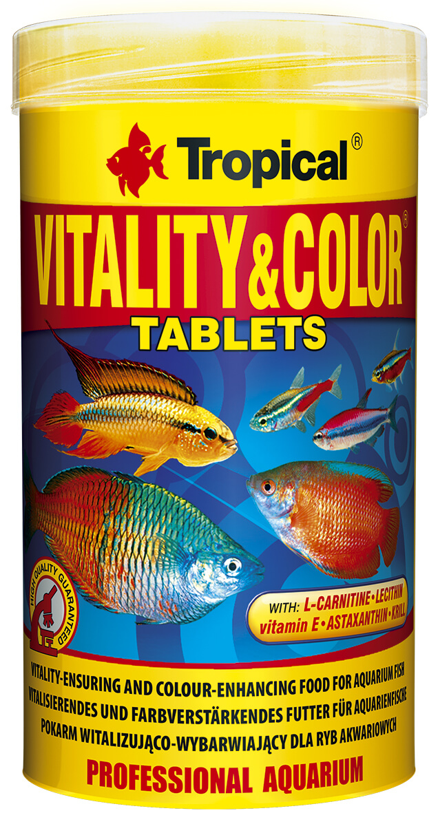 VITALITY & COLOR TABLETS sind proteinreiche, farbverstärkende und vitalitätsfördernde Hafttabletten. Sie sind als tägliches Futter für alles- und fleischfressende Aquarienfische, die ihr Futter in den mittleren Wasserschichten suchen, sowie für Bodenbewohner geeignet. Da die Tabletten aus kleinen Bestandteilen der Zutaten bestehen, können sie auch an heranwachsende Jungfische verfüttert werden.