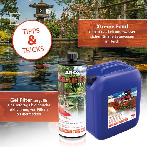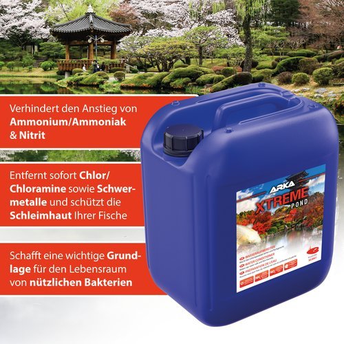 ARKA empfiehlt regelmäßige Wasserwechsel durchzuführen. Verwenden Sie XTreme Pond für jeden Wasserwechsel und bei Neustart zum Schutz aller Lebewesen im Teich. XTreme Pond ist auch als schnelle Hilfe in Notfällen geeignet, wie z. B. bei einem Anstieg von Ammonium/Ammoniak und Nitrit durch organische Materie.