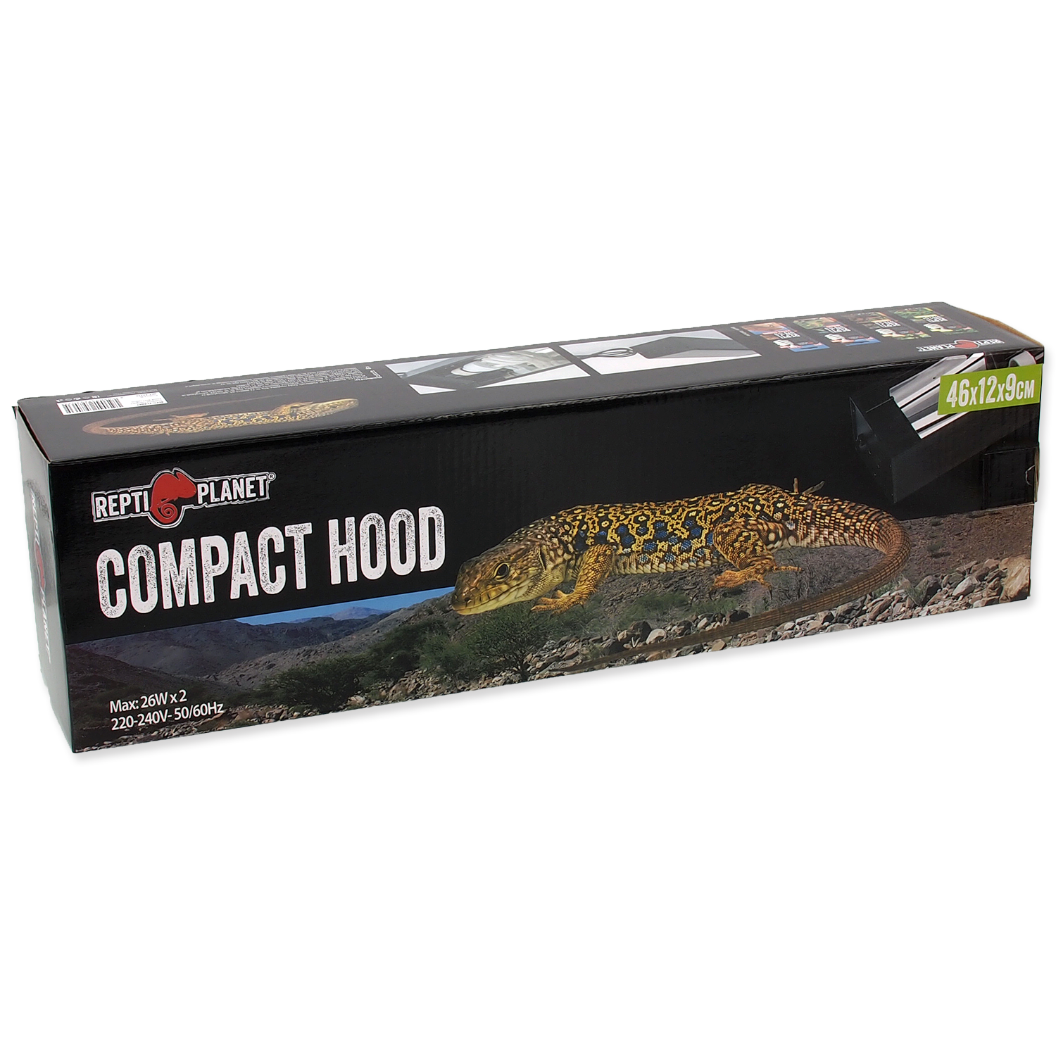 Die Lampenfassung Compact Hood von ReptiPlanet ist für Strahler bis 26W geeignet. Der hochglanzpolierte Aluminiumreflektor fördert die Wärme- und Lichtkonzentration und erhöht die Intensität der UVB- und UVA-Strahlung im Terrarium. Die Abmessungen der Lampenfassung ermöglichen die Montage direkt auf der Terrarien-Gitter-Abdeckung. Sie ist ideal für den Einsatz bei den ReptiPlanet Medium und Large Terrarien.