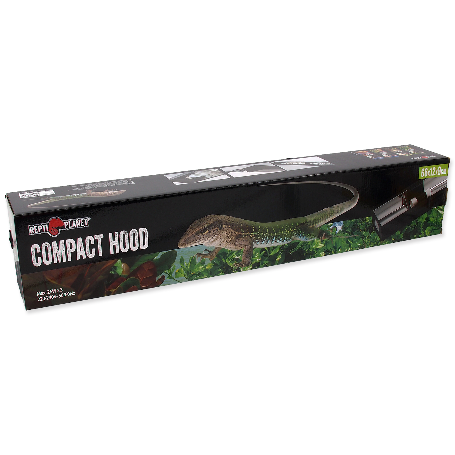Die Lampenfassung Compact Hood von ReptiPlanet ist für Strahler bis 26W geeignet. Der hochglanzpolierte Aluminiumreflektor fördert die Wärme- und Lichtkonzentration und erhöht die Intensität der UVB- und UVA-Strahlung im Terrarium. Die Abmessungen der Lampenfassung ermöglichen die Montage direkt auf der Terrarien-Gitter-Abdeckung. Sie ist ideal für den Einsatz bei den ReptiPlanet Medium und Large Terrarien.