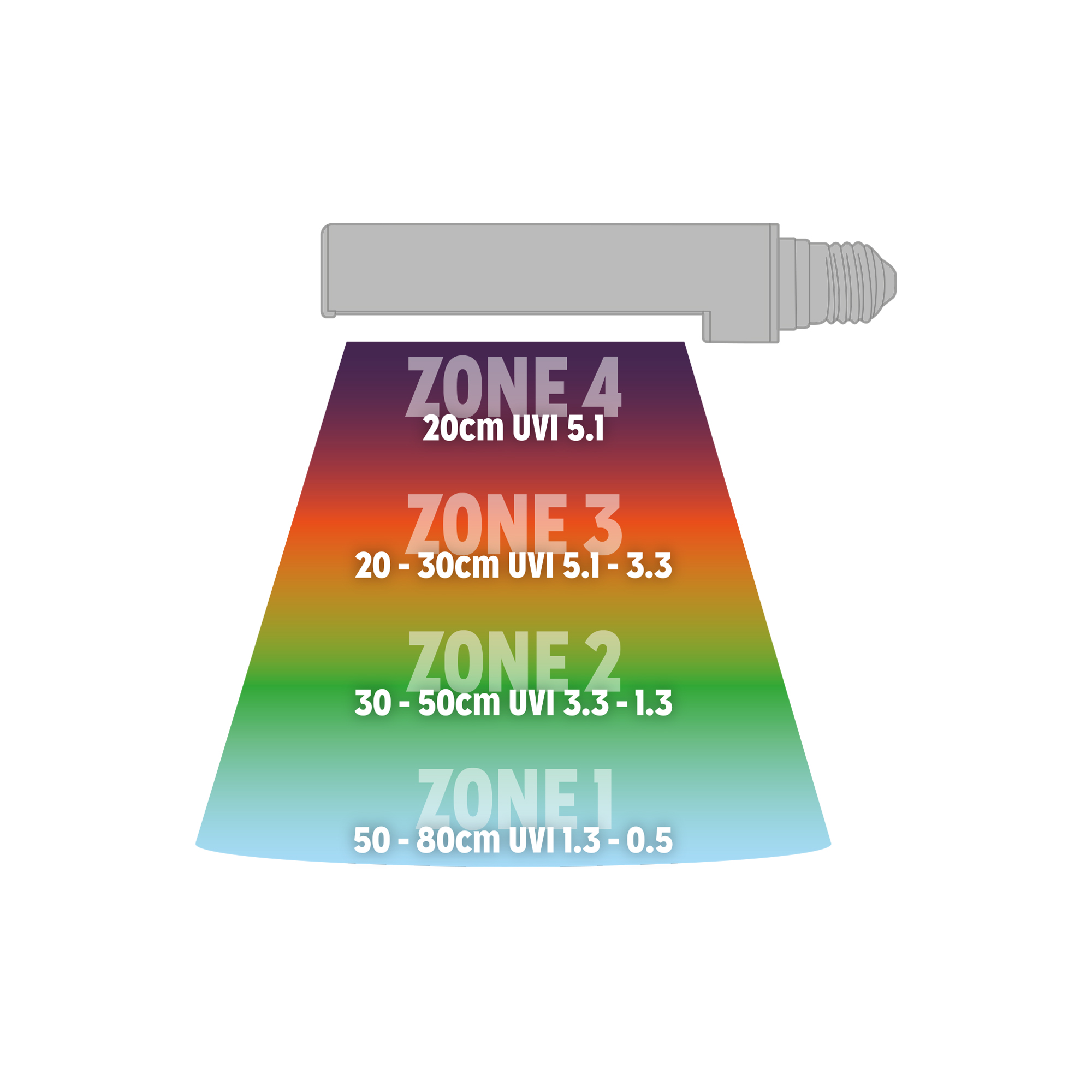 Je nach Entfernung kann die LED-Lampe UVI der Ferguson Zonen 1 bis 4 liefern und lässt sich zur Änderung des Abstrahlwinkels verstellen. Durch den Einbau von 3 Reihen spezieller LED-Typen (insgesamt 60 LEDs) liefert sie UVB-, UVA- und sichtbares Licht, das auch für Pflanzen geeignet ist. Damit werden die Beleuchtungsbedürfnisse einer Vielzahl von Tieren und Pflanzen gleichzeitig für die Photosynthese und die Vitamin-D3-Produktion abgedeckt.