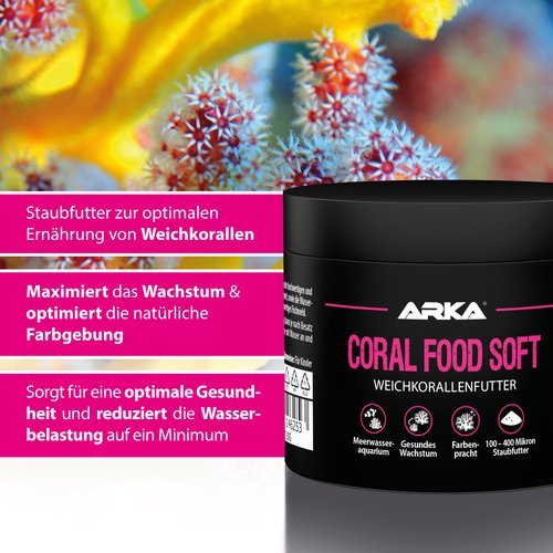 CORAL FOOD A Soft-Futtergranulat für Anemonen Coral Food A ist ein kaltgepresstes Soft-Futtergranulat zur optimalen Ernährung Ihrer Anemonen. Durch die sehr hochwertigen und speziell aufeinander abgestimmten Inhaltsstoffe wird die natürliche Farbgebung und das Wachstum optimiert, sowie die Wasserbelastung auf ein Minimum reduziert. Coral Food A enthält keine Spirulina (Cyanobakterien) und minderwertiges Fischmehl. Das schonende Verfahren der Kaltpressung sorgt dafür, dass sowohl Nährstoffe als auch Vitamine bei der Produktion optimal erhalten bleiben, da diese nicht durch hohe Temperaturen angegriffen werden. Das Futter ist dank der Kaltpressung und des speziellen Produktionsprozesses außerdem besser verträglich, da es im Magen der Fische nicht aufquillt (Softgranulat). Inhalt: 150ml Zusammensetzung: Fisch und Fischnebenerzeugnisse, pflanzliche Eiweißextrakte, pflanzliche Nebenerzeugnisse, Öle und Fette, Hefe, Weich- und Krustentiere, Algen, Mineralien, Vitamine.Analytische Bestandteile:Rohprotein 44 %, Feuchte 17 %, Rohfett 10 %, Rohasche 6,3 %, Rohfaser 1 %. Technologische Zusatzstoffe: Antioxidantien, Konservierungsmittel.Ernährungsphysiologische Zusatzstoffe: Vitamin A 26.250 i.E./kg, Vitamin D3 1.575 i.E./kg, Vitamin C 382 mg/kg, Vitamin E 101 mg/kg, Fe (Eisen(II)-Sulfat-Monohydrat) 27 mg/kg, Zn (Zinkoxid) 7,5 mg/kg, Mn (Mangan(II)-oxid) 5,6 mg/kg, Cu (Kupfer(II)-sulfat-Pentahydrat) 1,3 mg/kg, I (Kaliumiodid) 0,16 mg/kg. Dosierung:Geben Sie 1-3 Pellets pro Anemone in Ihr Aquarium hinzu. Die Dosierung kann je nach Besatz variieren. Tipp: Zur gezielten Fütterung Ihrer Anemonen verwenden Sie ein Futterrohr oder eine Futterpipette & geben Sie das Granulat direkt Ihren Tieren. Strömungspumpen während der Fütterung bitte abschalten. Anleitung Meerwasseraquarium Herstellerangaben:ARKA Biotechnologie GmbHMühllach 53-5590552 Röthenbach a.d. PegnitzTel: +49 (0)911 - 56 98 610 - 00Fax: +49 (0)911 - 56 98 610 - 29 Mail: info@arka-biotech.deVertreten durch:Oliver Schultheiß