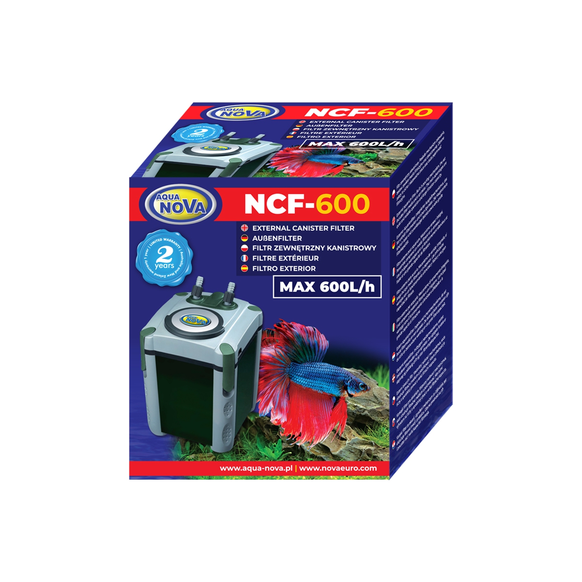 Der Außenfilter NCF von AquaNova verfügt über eine 2 Stufen-Filtration. Im Set enthalten sind Schläuche, Ansaugkörbe und ein Strahlrohr. Die Filtermedien sind bereits innen verbaut, dazu gibt es 1x weißen Schwamm, 1x schwarzen Schwamm, 500g Aktivkohle und 500g Keramikringe (Achten Sie darauf, die Filtermedien aus den Plastiktüten zu nehmen). Der NCF-600 ist ruhig und zuverlässig, mit abnehmbaren Anschlüssen und einem selbstansaugenden System für einen schnellen Start. Perfekt für Süßwasser- und Meerwasseraquarien.