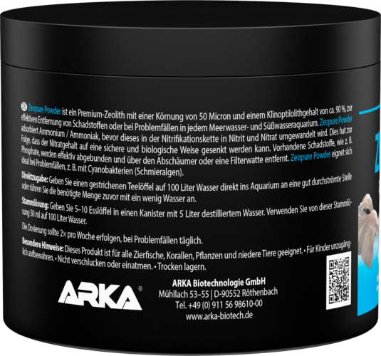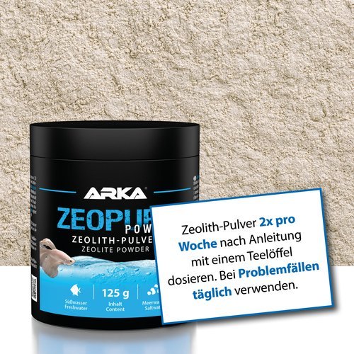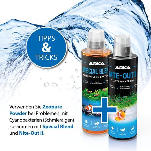 Zeopure Powder führt zu einer starken Wassertrübung. Nach einigen Stunden ist das Wasser kristallklar. Verwenden Sie für die Stammlösung nur destilliertes oder Reinstwasser. Verwenden Sie Zeopure Powder bei Problemen mit Cyanobakterien (Schmieralgen) zusammen mit Special Blend und Nite-Out II.