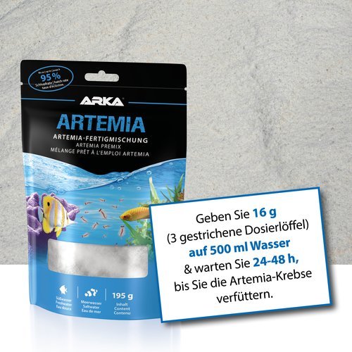 Dosieren Sie 3 Löffel (~ 16 g) der Artemia-Fertigmischung auf 500 ml Wasser. Warten Sie 24-48 Stunden und füttern Sie die Artemia/Nauplien als Lebendfutter an Ihre Fische, Korallen und niedere Tiere.