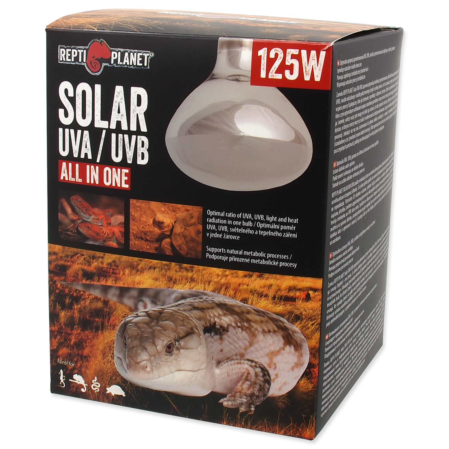 Die Solar UVA/UVB all in one Beleuchtung von ReptiPlanet bietet ein optimales Verhältnis von ultraviolettem Licht (UVA-, UVB-Strahlung), sichtbarem Licht und Infrarotlicht (Wärme) in einer Glühbirne.