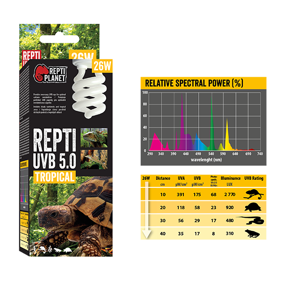 REPTI UVB 10.0 DESERTUVB-Beleuchtung für WüstenreptilienDie Repti UVB 10.0 Desert von ReptiPlanet ist ideal für alle Wüstenreptilien. Der optimale UVB-Wert ahmt sonnige Wüstengebiete nach und ist bis zu einem Abstand von 40cm zum Sonnenplatz optimal (Mindestabstand zur Quelle beträgt 10cm). Die Beleuchtung liefert auch UVA-Strahlen, die die Aktivität, den Appetit und die Fortpflanzung der Tiere anregen. Die optimale UVB-Intensität hilft bei der Umwandlung von Vitamin D3, das für die Kalziumaufnahme sorgt. UVB-Strahlung ist Bestandteil des Sonnenlichts, das für die Gesundheit von Terrarientieren wichtig ist und Stoffwechselerkrankungen vorbeugt. Die Intensität der UVB-Strahlung in Lampen nimmt während des Gebrauchs ab (über 1 Jahr um mehr als 50 %), daher sollte ein regelmäßiger Austausch durchgeführt werden! Bei der Auswahl einer Lampe muss neben dem Typ der UVB-Lampe auch die zu züchtende Tierart und die Entfernung des Tieres von der Quelle der UVB-Strahlung berücksichtigt werden.Lampen und Leuchtstofflampen unterliegen einer normalen Garantiezeit. Sie gilt jedoch nicht für den Bruch von Lichtfasern, Schlauchbruch und Gasaustritt, der auf normalen Gebrauch zurückzuführen ist (die Standardlebensdauer beträgt etwa 6 Monate).Kombinieren Sie bei Bedarf mit Heiz- und Beleuchtungslampen (z.B. Repti Planet Infrared Heat, Daylight Basking Spot, Daylight Frosted, Daylight Neodymium, Far Infrared Heat oder Night Heat).Herstellerangaben: Plaček Pet Products, s.r.o.Revoluční 1381/III290 01 PoděbradyCzech RepublicE-mail: export@placek.czPhone: +420 325 611 650FAX: +420 325 610 077 Verantwortlich für West-Europa und Amerika: Mr. Klaus Reimueller Mail: Klaus.Reimueller@placek.cz Phone: +49 174 311 0105