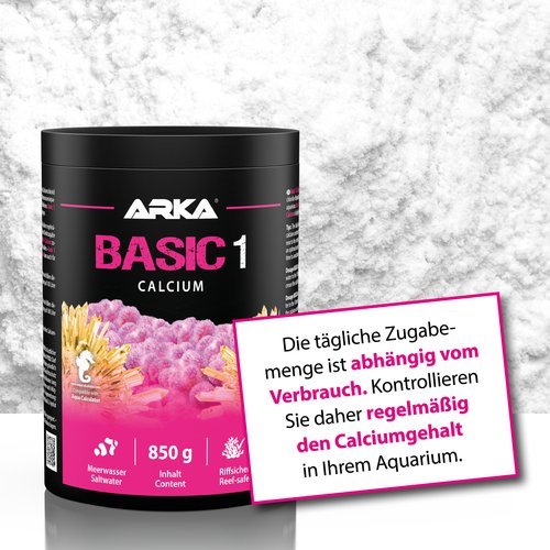 Die tägliche Zugabemenge ist abhängig vom Verbrauch. Kontrollieren Sie daher regelmäßig den Calciumgehalt in Ihrem Aquarium. Dosieren Sie Basic 1 Calcium bei einer Direktzugabe in die Nähe der Rückförderpumpe in Ihrem Technikbecken. Verwenden Sie Basic 1 Calcium zusammen mit dem ARKA Basic-System für eine optimale Grundversorgung Ihrer Korallen. Basic 1 Calcium und Basic 3 Carbonat immer zeitlich versetzt dosieren. Basic 1 Calcium kann auch für die ursprüngliche Ballingmethode verwendet werden.