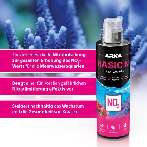 Plants N ist ein speziell entwickelter Stickstoffdünger für alle Arten von Wasserpflanzen in Süßwasseraquarien. Er unterstützt einen prachtvollen Pflanzenwuchs und beugt einem Stickstoffmangel Ihrer Wasserpflanzen nachhaltig vor. Plants N ist frei von Phosphat. Um eine bestimmte Stickstoff-Ebene zu erreichen verwenden Sie folgende Formel: m = v*n/15m = die zu verwendende Menge in mlv = das Volumen Ihres Aquariums in Liter abzgl. Dekorationn = die gewünschte Stickstoff-Ebene Für das maximale Pflanzenwachstum verwenden Sie Plants N in Kombination mit der ARKA Düngeserie. Bei zu niedrigen Nitratwerten können die Wasserpflanzen im Wuchs stagnieren. Dosierung: Geben Sie 1 ml auf 100 Liter Wasser hinzu, um den Nitratgehalt um 0,5 mg/L zu erhöhen.Hinweis: Der optimale Nitratgehalt liegt bei 5-10 mg/L. Dieses Gemisch erfüllt nicht die Kriterien für die Einstufung gemäß der Verordnung Nr. 1272/2008EG. SicherheitsdatenblattAnleitung DüngerserieAnleitung Süßwasseraquarium Herstellerangaben:ARKA Biotechnologie GmbHMühllach 53-5590552 Röthenbach a.d. PegnitzTel: +49 (0)911 - 56 98 610 - 00Fax: +49 (0)911 - 56 98 610 - 29 Mail: info@arka-biotech.deVertreten durch:Oliver Schultheiß