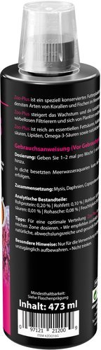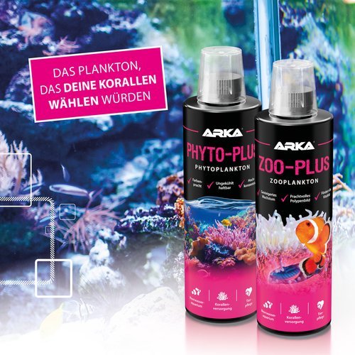 Phyto-Plus ist ein speziell entwickeltes Phytoplankton für alle Korallen und niedere Tiere in Meerwasseraquarien. Es steigert das Wachstum und die natürliche Farbgebung durch den hohen Gehalt an essentiellen Fettsäuren, Kohlenhydraten, Aminosäuren, Lipiden, Omega-3-Fettsäuren und natürlichen Biopigmenten. Phyto-Plus enthält Dunaliella Spp., Spirulina Platensis Ageitler, Platymonus Spp., Phaeodactylum Tricornutum in einer speziell konservierten Form.Analytische Bestandteile:Rohprotein: 0,01%Rohfett: 0,05%Rohfaser: 0,06%Omega-3-Fettsäuren: 0,02%Rohasche: 0,07%Feuchtigkeit: 99,70%Verwenden Sie eine Futterpipette zur gezielten Fütterung Ihrer Korallen. Verwenden Sie Phyto-Plus in Kombination mit Zoo-Plus für eine natürliche, abwechslungsreiche und gesunde Ernährung. Dosierung: Geben Sie 1-2 mal pro Woche 5 ml auf 100 Liter Wasser hinzu. Hinweis: In dicht besetzten Meerwasseraquarien kann die Dosierung täglich erfolgen. Anleitung Meerwasseraquarium Herstellerangaben: ARKA Biotechnologie GmbHMühllach 53-5590552 Röthenbach a.d. PegnitzTel: +49 (0)911 - 56 98 610 - 00Fax: +49 (0)911 - 56 98 610 - 29 Mail: info@arka-biotech.deVertreten durch:Oliver Schultheiß
