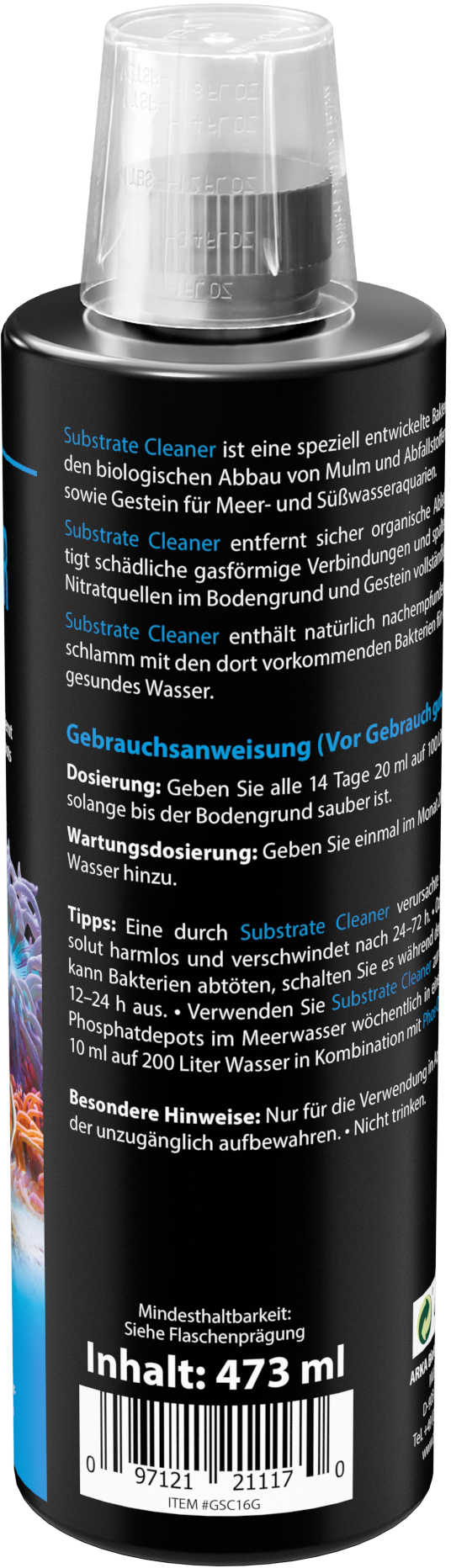 Dosieren Sie während der Verwendung von Substrate Cleaner keine Kohlenstoffquellen, wie z.B. NO3PO4 Control. Beachten Sie, dass Bakterien zwingend eine gewisse Menge an Phosphat als Energiequelle benötigen, um wichtige biologische Prozesse im Aquarium auszuführen. Ozon und UV-Licht kann Bakterien abtöten, schalten Sie diese nach der Dosierung für 12-24 h aus. Lassen Sie für eine ausreichende Sauerstoffzufuhr Ihren Abschäumer dauerhaft eingeschaltet, da Bakterien auch Sauerstoff verbrauchen. Nehmen Sie Phosphatabsorber-Granulate während der Trübungsphase aus dem Wasserkreislauf. Bewahren Sie diese währenddessen z.B. in einer Tüte auf, die Sie luftdicht verschließen. Um die Trübung zu reduzieren, können Sie die Dosierung halbieren und wöchentlich bzw. alle 14 Tage durchführen. Geben Sie alle 14 Tage 20 ml auf 100 Liter Wasser hinzu, solange bis der Bodengrund sauber ist.